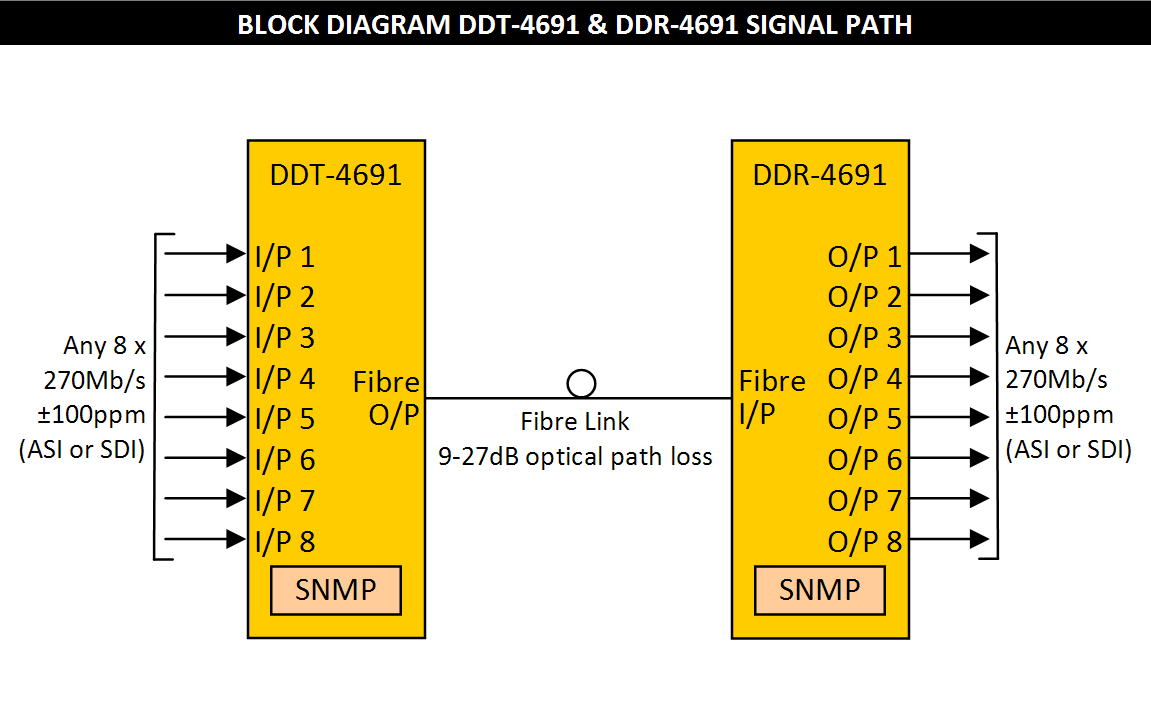 The DDT-4691 accepts up to eight 270 Mb/s input signals which may be ASI, SDI or a mixture of each type. The signals need not be phase or frequency synchronous. | ||