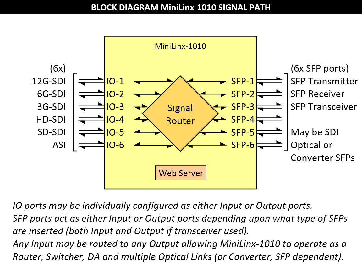 The MiniLinx-1010 is a portable Multi-Channel Router, Switcher, Distribution Amplifier, Signal Converter1,2 or Multiple