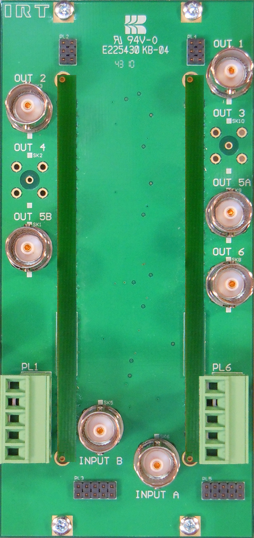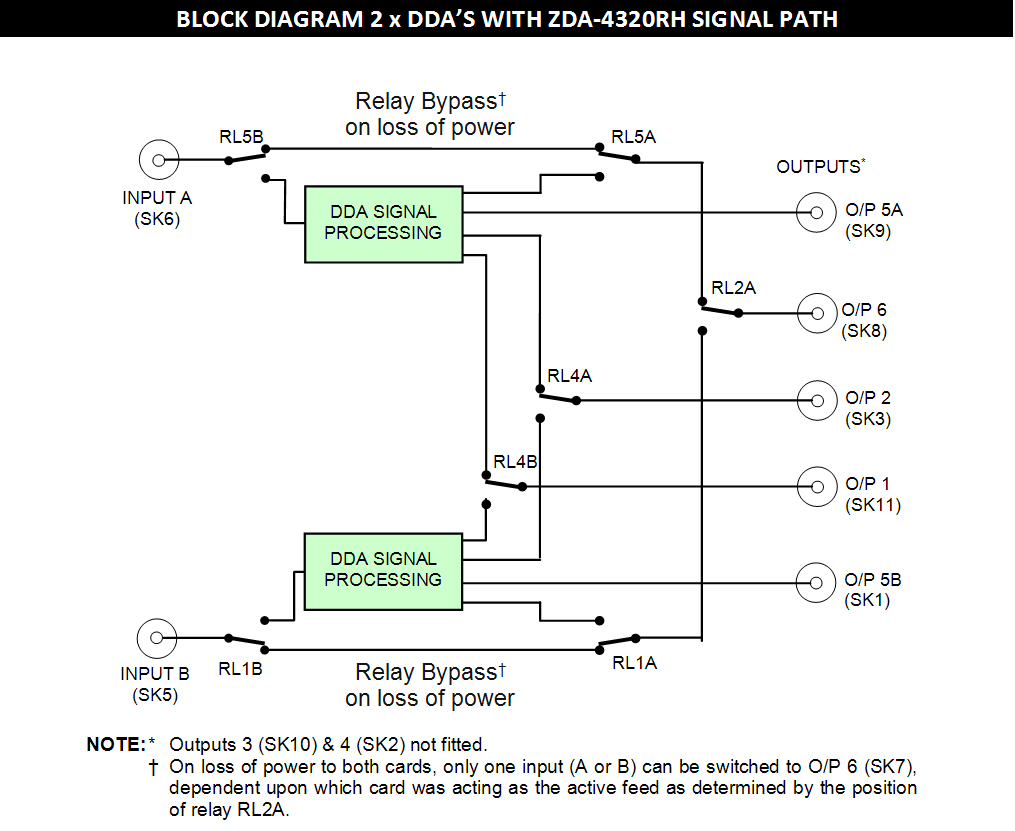 (Relay bypass of active input (SK5 or SK6) to output (SK8) on loss of power or removal of both cards). |