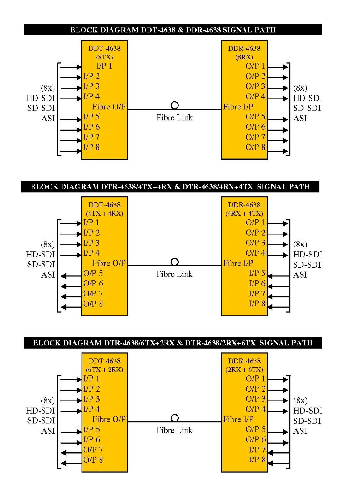 The IRT DDT-4638 and DDR-4638 are 8 channel transmit and receive modules designed principally for use as eight independent serial data fibre optic transmission links for HD-SDI or SD-SDI applications conforming to SMPTE standards 292M and 259M-C using 9/125 µm single mode fibre |